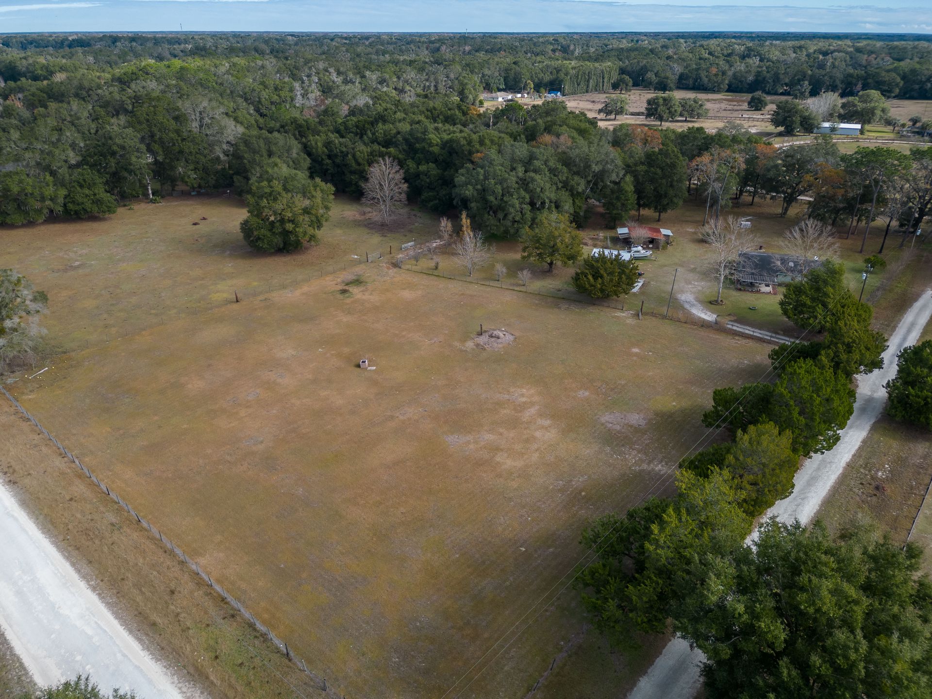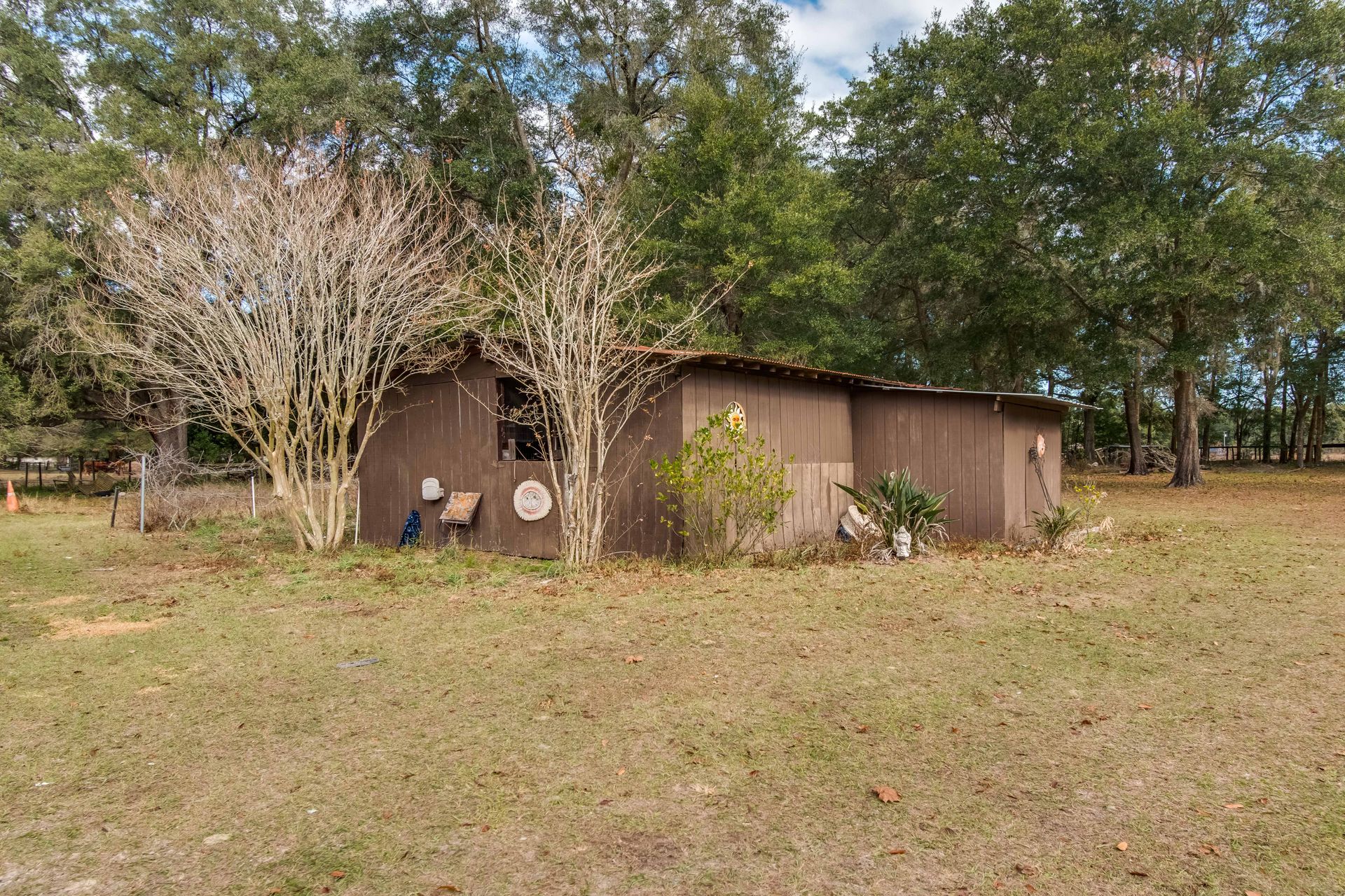 Within the quiet equestrian community of Millwood Acres in Citra, this inviting farm is fenced and nicely private with just under 4 and a half acres of space. Situated on a large corner lot, this property features mature orange, pecan, and pomegranate trees and an attractive country landscape. At the heart of the acreage is the 3-bedroom, 1-full and 1-half bath home. A large covered porch provides ample space for a set of rocking chairs or other seating at the front of the home. Stepping inside, the interiors feature a split bedroom floor plan with tall cathedral ceilings, and several skylights throughout the main portions of the home. The kitchen is great for those who enjoy cooking, with lots of counter and cabinet space, stainless steel appliances, pantry, and an adjacent dining area with bay windows. There are some areas of the home that could do with a bit of updating and care, but there is a ton of potential. To the back of the home is a large covered patio with lots of space for seating and entertaining while enjoying views of the surrounding property. A 2-stall barn is already established on property, but could do with some care as well, and the workshop provides a great space for those who enjoy spending time with their hands. This farm is perfectly located between both Ocala and Gainesville, opening up the option for a variety of shopping, dining, event, and medical options with just a short drive. Orange Lake is located just minutes away from the farm and a variety of other water, park, and trail options are nearby for those who enjoy spending time outdoors. If you’re looking for a property that is ripe for further customization, this is a wonderful option to consider!
