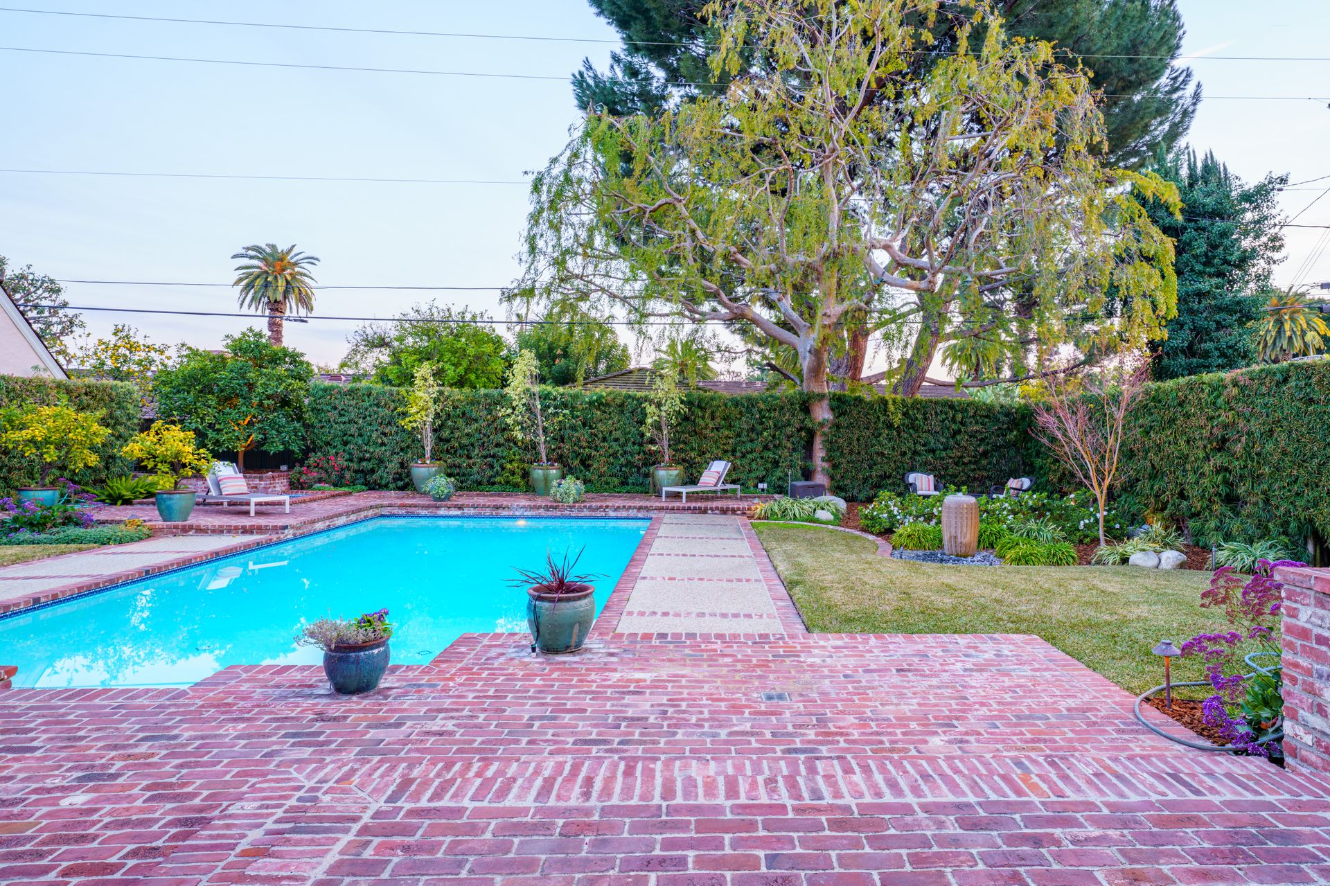 The backyard is surrounded by a mature hedge for privacy, and features a sparkling pool and separate hot tub controlled by Jandy. The built-in BBQ has side cooktops and griddle, with poolside seating under an intricate trellis. Two water features and mature citrus trees accent the backyard.