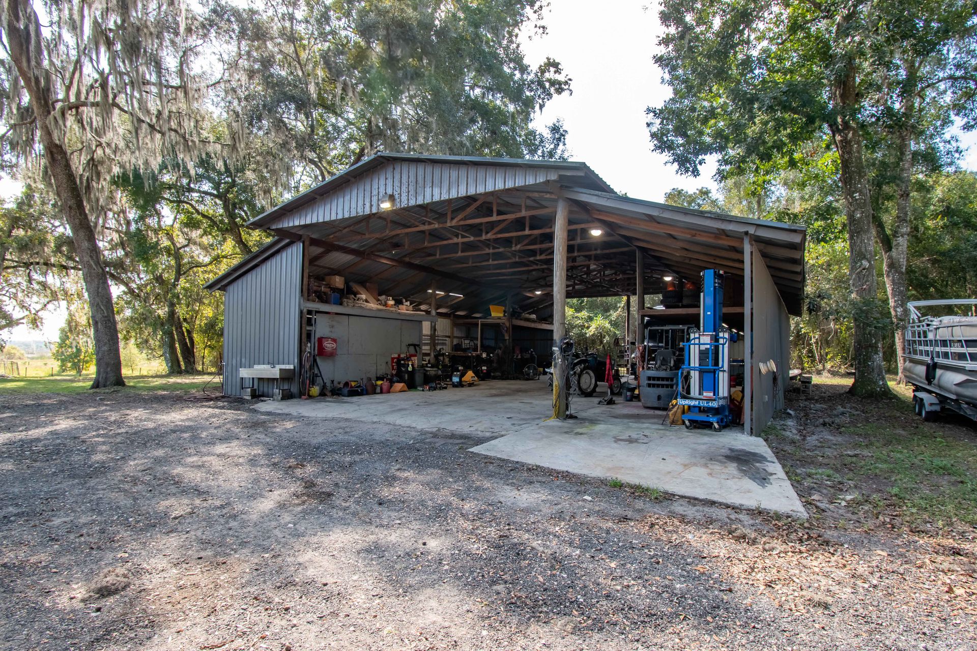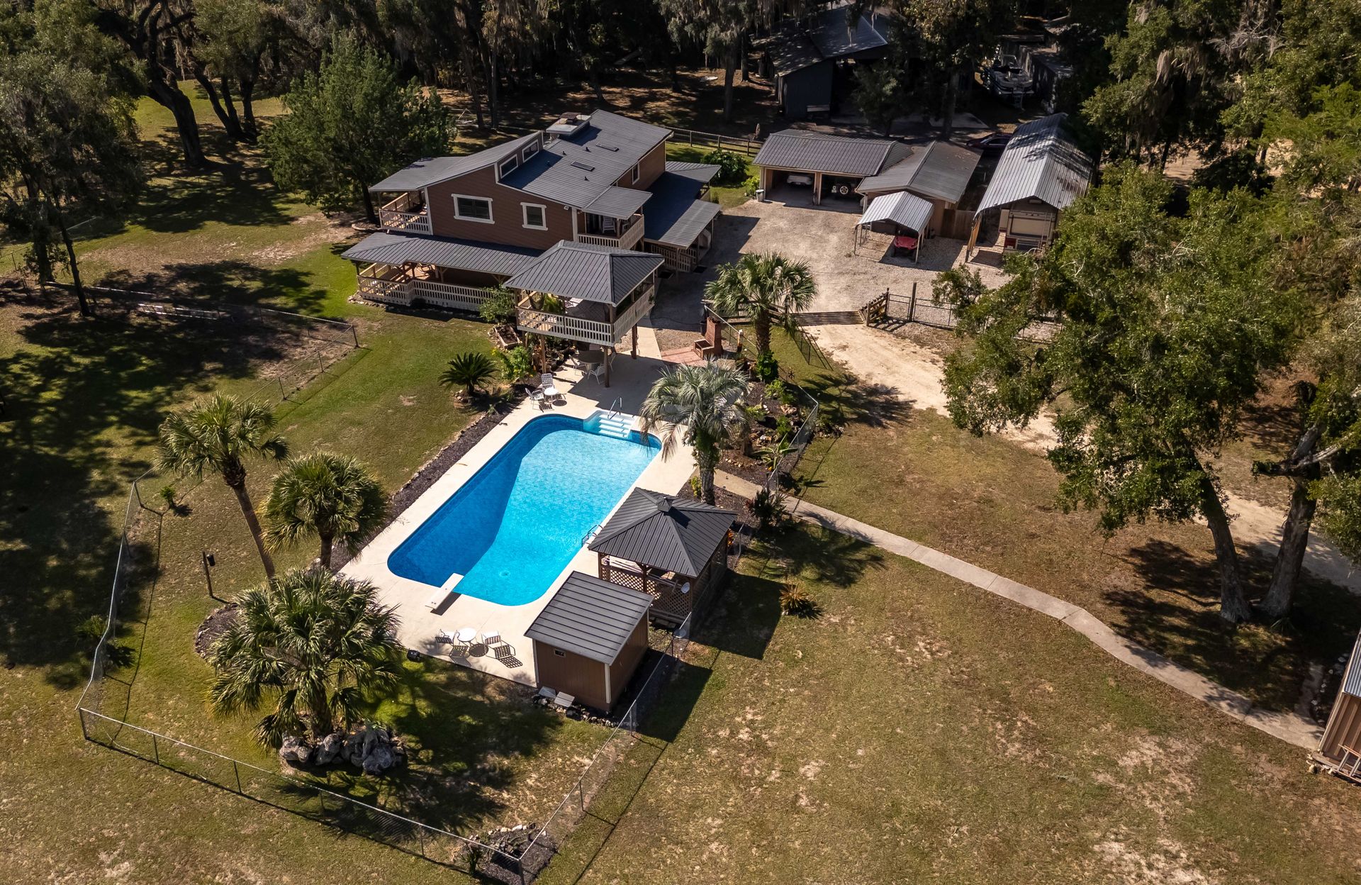 Experience the perfect blend of rustic charm and modern functionality at this unique rural prairie retreat! Expansive spaces meet unparalleled work and recreational amenities on this picturesque 50+ acre property, which is situated on a quiet stretch of Central Florida countryside. The main residence is a lovely country-style construction with a total of 4-bedrooms and 2-baths with over 2,000 sqft. A variety of custom touches can be found throughout including a black walnut staircase, stone and wood accent walls, skylights, large windows, and more. Both of the upstairs bedrooms include private balconies, offering quiet spaces to enjoy the surrounding property’s stunning natural beauty. The home also features a full unfinished basement that doubles as a storm shelter, providing peace of mind and extra storage flexibility. Recreational features abound, beginning with a sauna by the pool, an inviting gazebo, and a second-story pool patio complete with fans and electric, creating a space well-suited for relaxation or outdoor entertaining. An enchanting one-bedroom, one-bath tree house overlooks the prairie, offering an exclusive retreat for potential Airbnb guests, or a unique getaway right on the property. This property includes a remarkable second-floor apartment in a Quonset barn, featuring two bedrooms, two bathrooms, a newer A/C unit, and brand-new appliances, all complemented by a spacious deck with sweeping prairie views. The main level of the Quonset building also includes three stalls connected to a small paddock, along with a bathroom and laundry room, making it ideal for flexible use. For RV enthusiasts or those seeking rental potential, the property is equipped with two RV hook-ups with septic, one of which hosts a permanent RV. Expansive workshop spaces further enhance this property’s utility, starting with a 3,000-square-foot shop garage adjacent to two container storage units, ideal for equipment and supplies. A second, larger 4,000-square-foot workshop offers 200-amp service, water, and a concrete floor, providing an excellent setup for heavy-duty projects or business needs. Additionally, a detached two-car garage with an air-conditioned office offers further storage or workspace options, perfect for a dedicated office setup or additional hobby space. For those interested in both privacy and natural beauty, the property’s landscape includes 300 cypress trees planted 20 years ago, now fully mature and ready for potential harvest. Both Ocala and Gainesville are a scenic drive from the property, opening up a huge variety of shopping, dining, and entertainment options to explore year-round. With an ideal mix of residential comfort, expansive workspace, and recreational features, this property offers a unique lifestyle with abundant possibilities, all in a peaceful prairie setting.