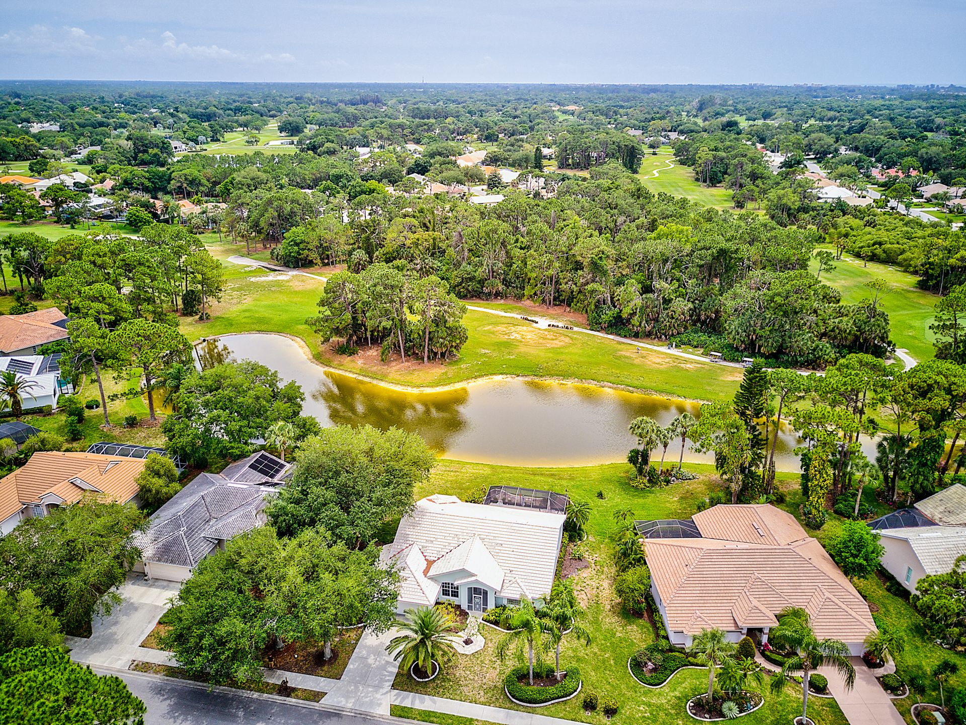 Captivating and tranquil pond view is the backdrop for this Calusa Lakes home. You will be thrilled with the oversized lanai which is ideal for entertaining or just relaxing as you watch the golfers off in the distance. This 3 bedroom 2 bath home hosts cathedral ceilings and an open floor plan. The split design is ideal for in-laws or guests providing them with their own suite with private full bath. There is also additional square footage in the air-conditioned Florida room and a Murphy bed is included in the third bedroom. There are Corian counter tops and a desk area in the kitchen. Piping in the home has been relined and they have installed a new garage door. The large laundry room provides ample storage and the home does have hurricane shutters. This is in the maintenance free section which takes care of your lawn care as well as the renovated heated community pool which is yours to enjoy. Calusa Lakes is situated on a semi-private golf course nestled among mature and lush landscaping and no additional membership is required. This gated community is a short drive to Nokomis beach and quaint shops and restaurants. Welcome to paradise!