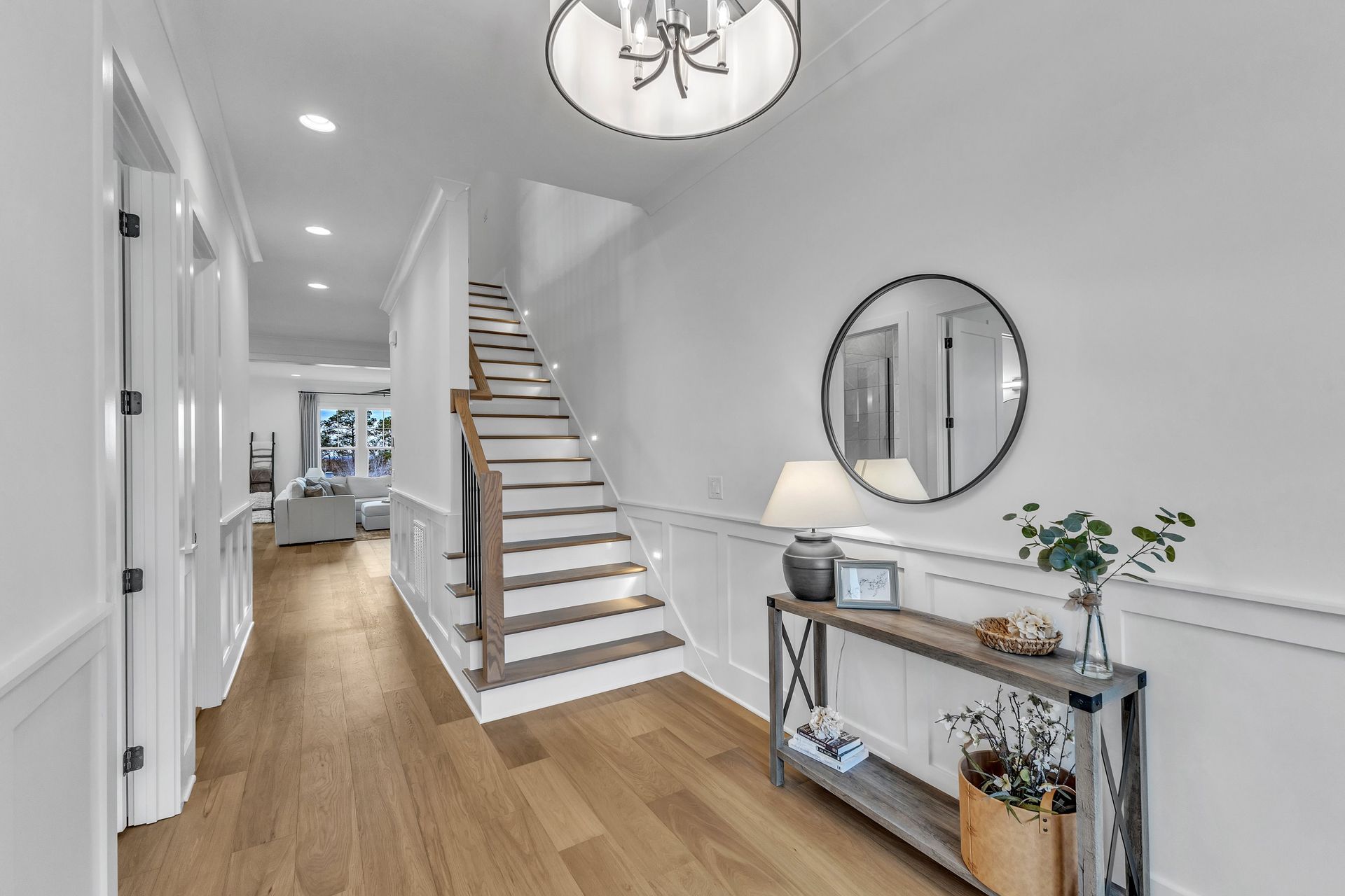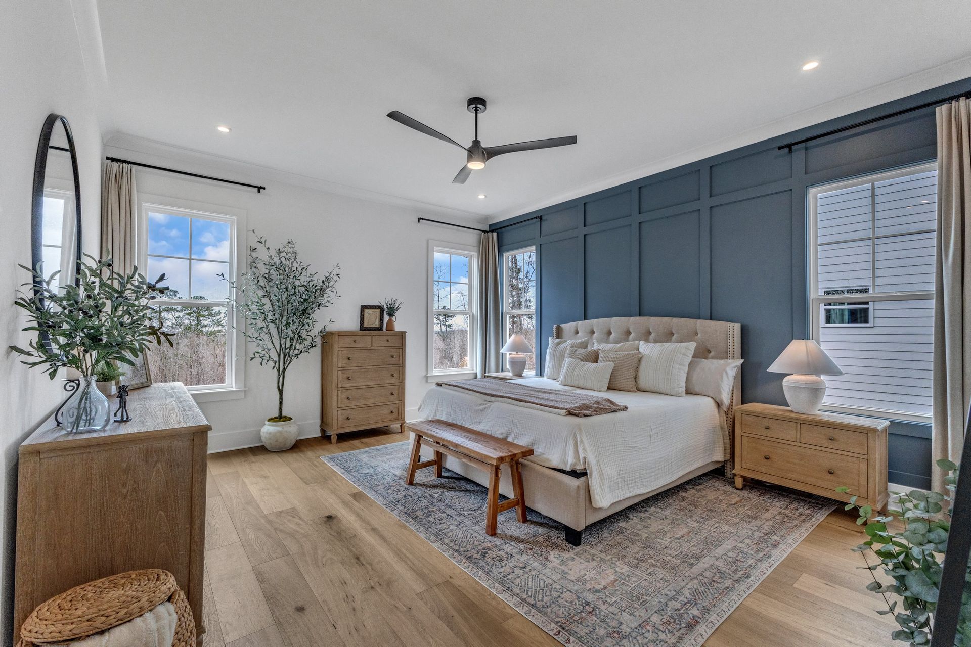 The first-floor primary suite is a serene retreat, featuring a custom accent wall, breathtaking backyard views, and a spa-like en-suite bath. Relax in the freestanding soaking tub, enjoy the walk-in tile shower, and make use of the dual vanity. The walk-in closet is a dream, complete with built-in wood shelves, boxed shoe storage, and sweater boxes.