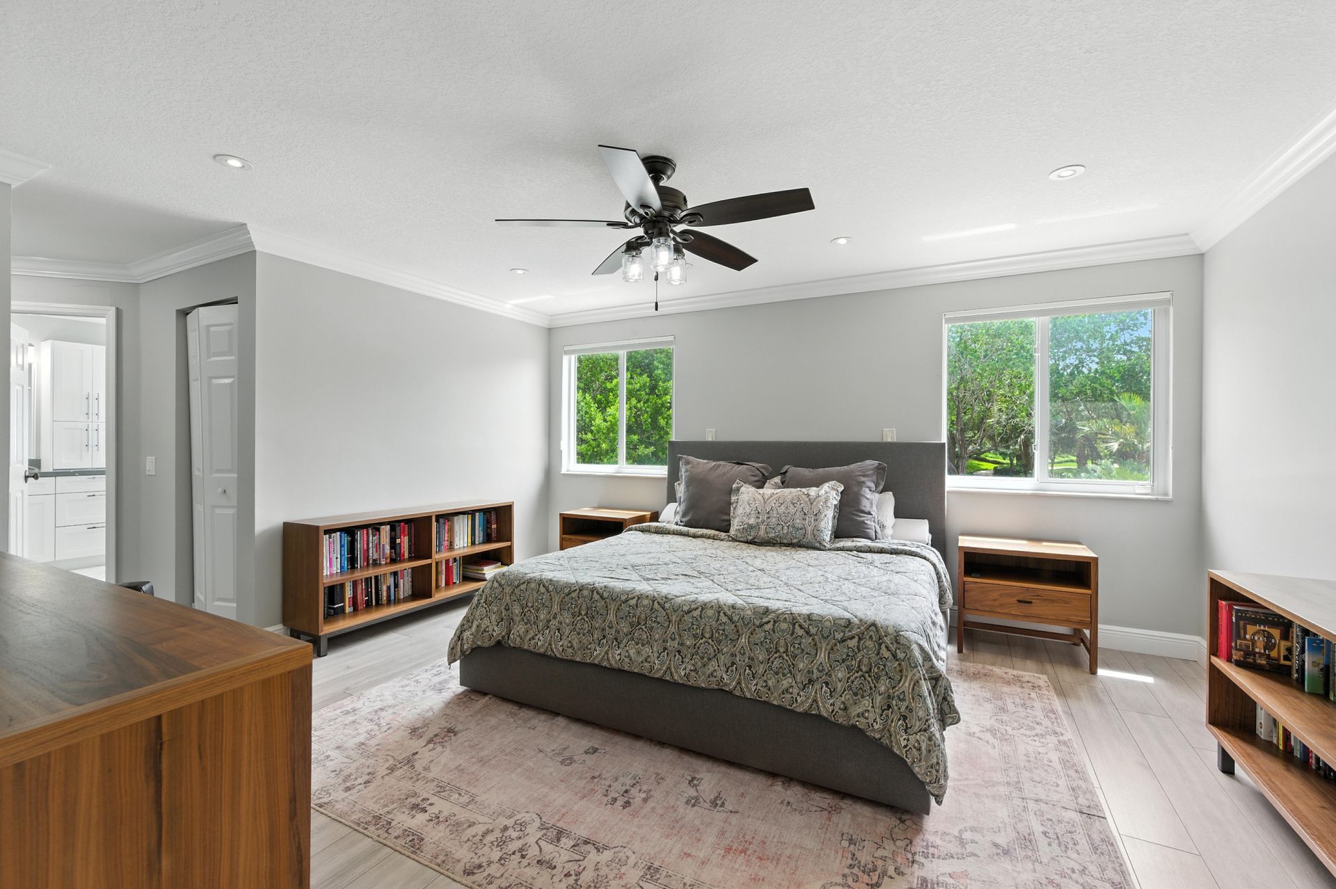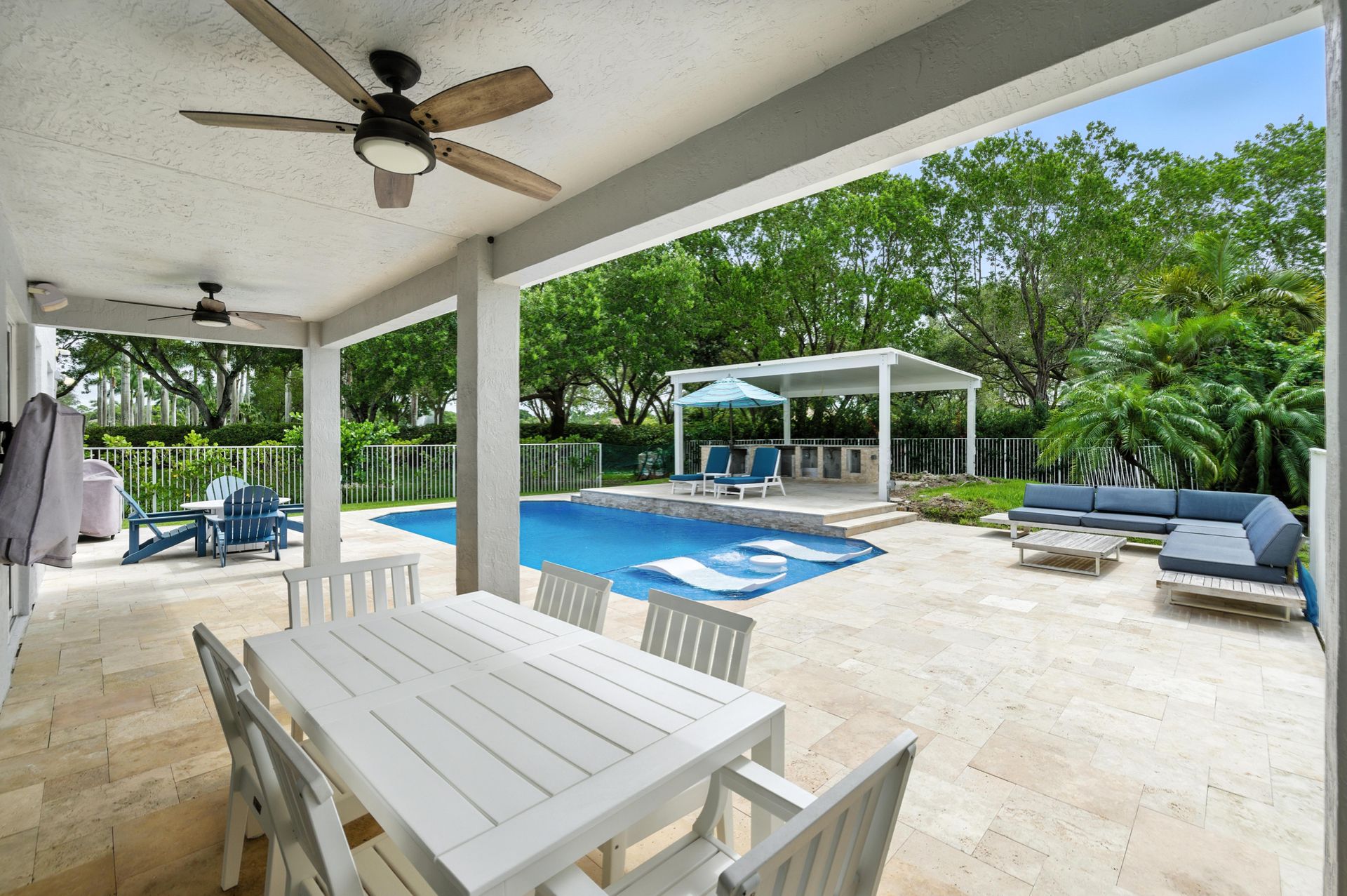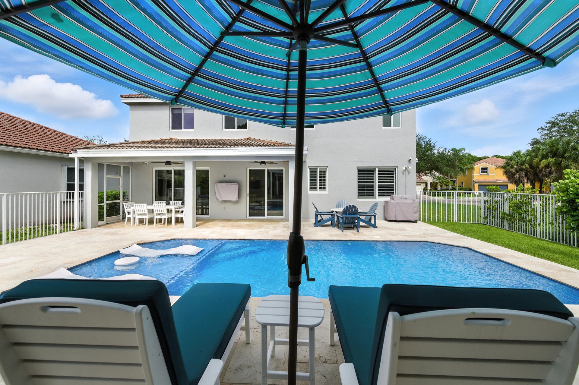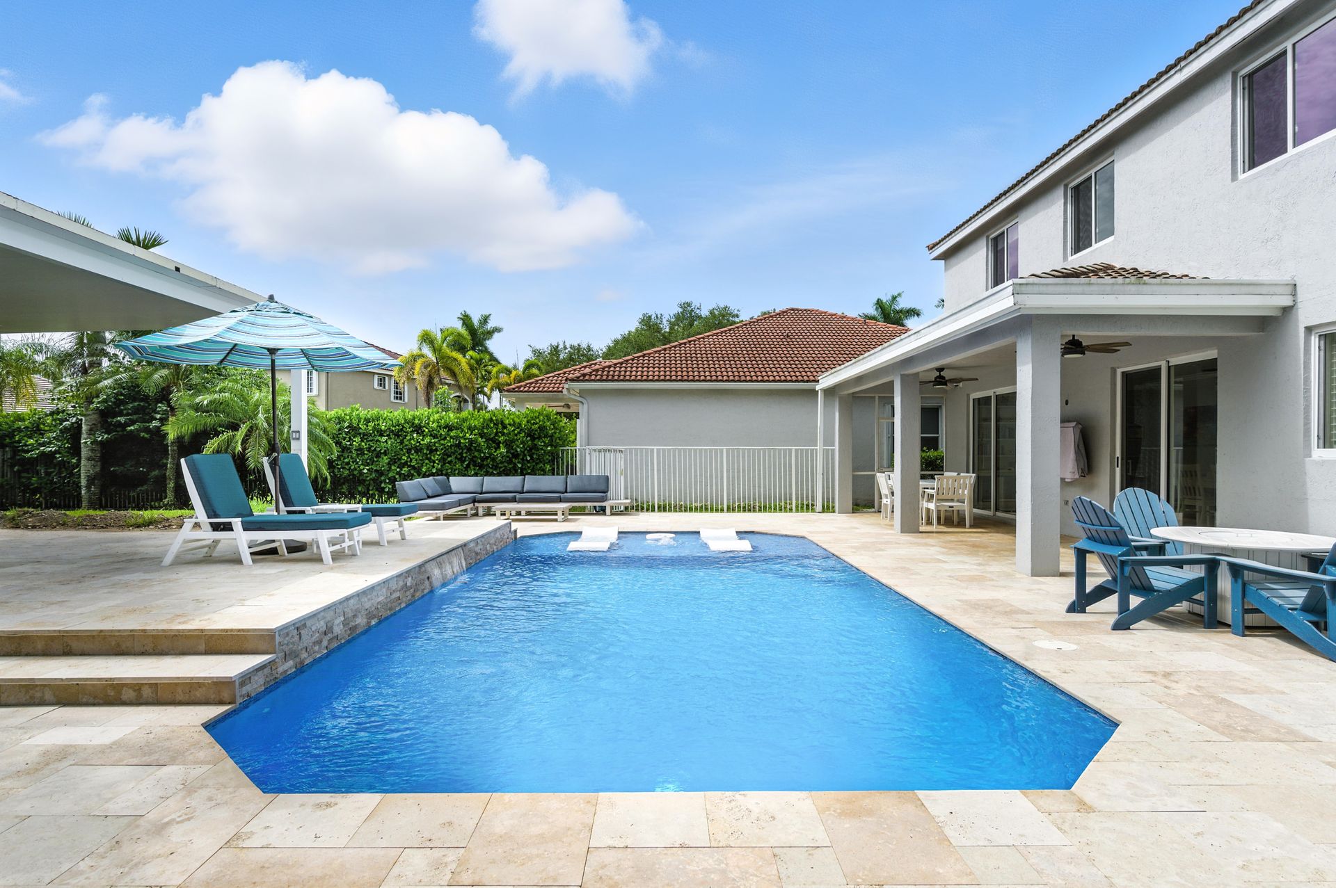 This resort-style modern home features hurricane-impact windows/doors (2023), an open kitchen with center island, and a private outdoor paradise. The saltwater pool was redesigned with waterfall features, new heater (2021), resurfaced in 2024 with a bonus sun ledge. A high-end cabana includes a full outdoor kitchen with pergola, granite countertops, bar seating, refrigerators, gas BBQ & griddle. Bathrooms were fully renovated in 2022. Engineered wood flooring throughout, custom millwork with crown molding, plantation shutters, custom built-ins (2022), and Closets by Design systems (2020). Ample storage, quiet cul-de-sac, and a spacious double lot with open space. Gated Community with pool, park, pickleball ball, & close to A schools, restaurants, retail, and library.